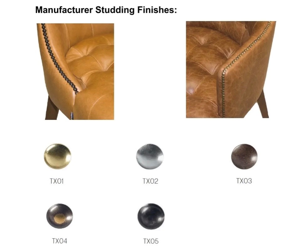 Royale Lounge Chair / Curved Back For Added Comfort / Button Back Seat And Internal Back For Added Upholstery Detailing / Can Be Upholstered In Fabric, Vinyl Or Leather / Nail Head Detailing On Outer Back In Various Metal Colour Finishes / Beech Tapered Legs / On Glides / Upcharge For Additional Wood Stain Finishes / Upcharge For Two Tone Upholstery / Ideal For All Restaurants, Hotels, Steakhouses, Country Clubs And Casinos