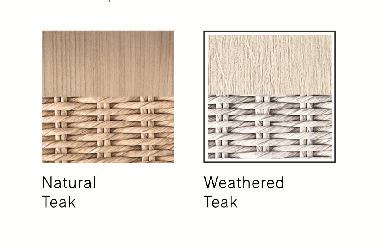 Hibiscus / Available in 3 sizes; loveseat, medium and extra large / Generous seating proportions / Solid hand crafted premium, sustainable real teak frame with integrated arms for all year round outdoor use / Available in weathered teak or natural teak / On nylon glides / All-weather wicker back panel wrapping around corners for added detail / Removable premium quick dry cushions with quick drying foam specifically engineered to drain water rapidly / Cushions available in a wide variety of performance outdoor fabric colours with fade protection / Cushion zip with resist corrosion properties / Upcharge for outdoor covers / Ideal for all high-end outdoor dining areas for hotels and restaurants, country clubs and retail.