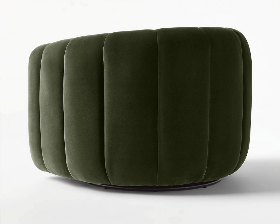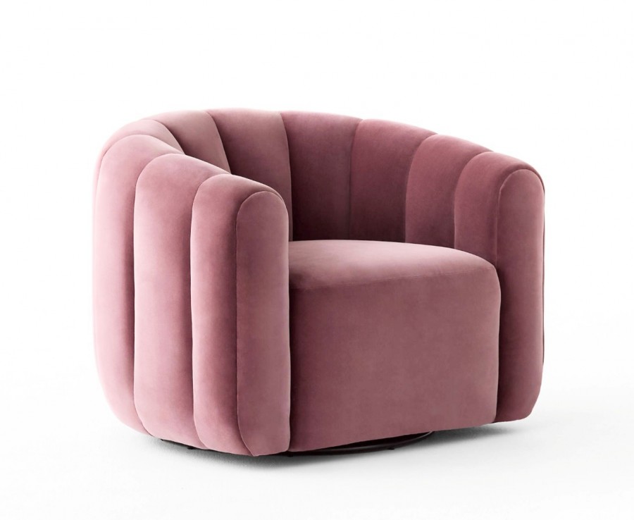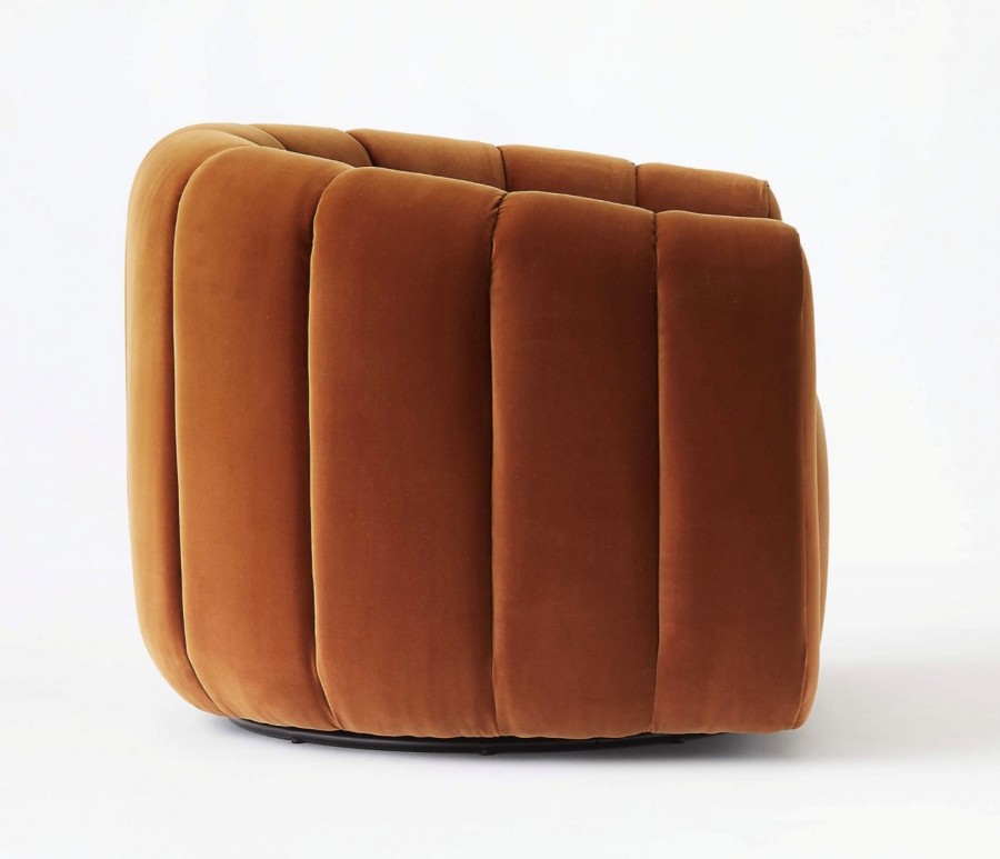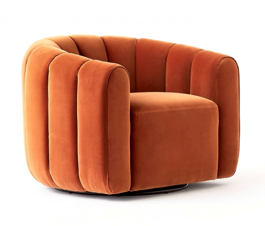 Channelled inner and outer sides and back upholstered for added detail / Fully upholstered / Generous proportions / Solid hardwood frame with well-padded seat / Wide choice of fabric options / Available in two tone upholstery / Well-weighted disc base on floor for swivel motion / Sprung seat / Ideal for all lobby areas and hospitality environments.