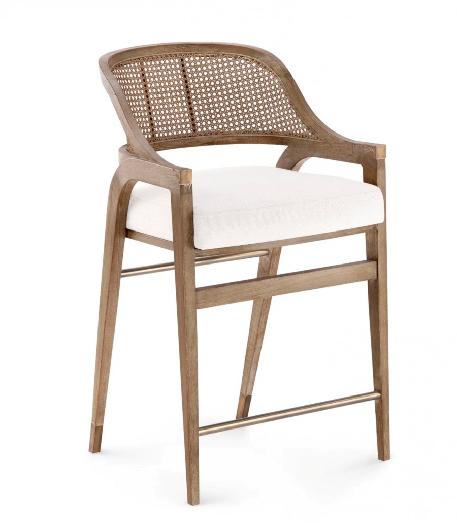 Pilkington Stool / Available In Counter Or Bar Height /Beechwood Frame Standard / Additional Wood Finishes Available /Wooden Tapered Legs / With Integrated Arms / Curved Breathable Cane Back Offering Excellent Back Support / Braced Under Seat For Heavy Contract Use With Additional Brace On Front / Brass Round Metal Tubular Footrest and Matching Rear Brace / Well-Padded Seat Cushion Fully Upholstered In A Wide Choice Of Fabrics, Vinyls and Leathers or COM / Matching Dining Chairs Available / Idea For All Restaurants, Bars, Hotels, Country Clubs & Retail Environments.